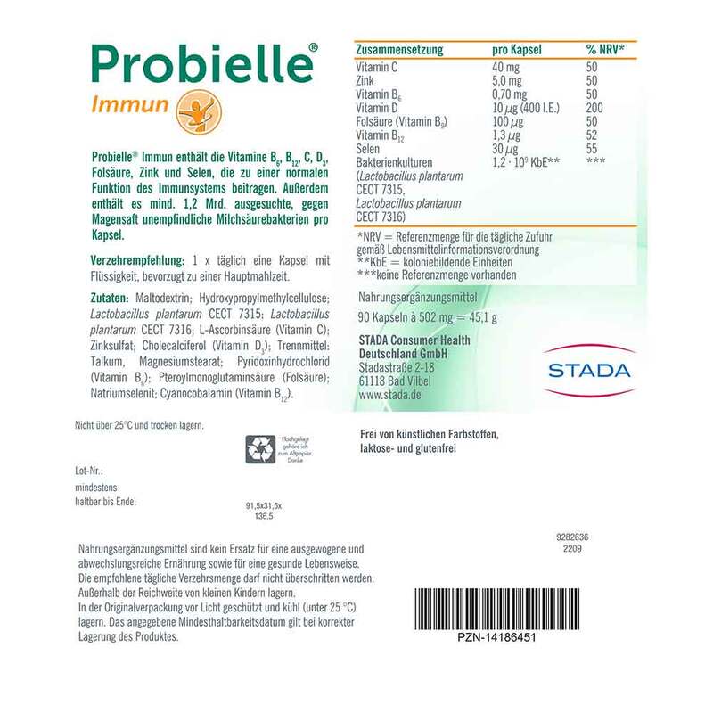 Probielle Immun ist ein Nahrungsergänzungsmittel mit den Vitaminen A, B6, B12, C und Folsäure sowie mit den Mineralstoffen Zink und Selen. Außerdem beinhaltet es folgende 2 Stämme mit mindestens 1,2 Milliarden ausgesuchten, gegen Magensaft unempfindlichen Milchsäurebakterien pro Kapsel: Lactobacillus plantarum CECT 7315 und Lactobacillus plantarum CECT 7316.