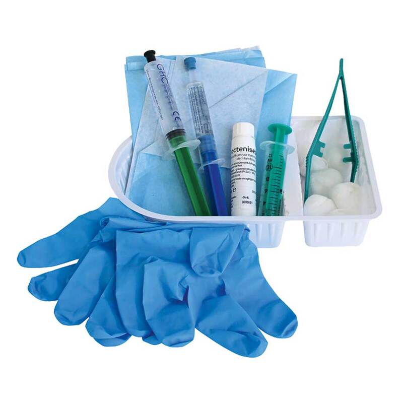 Äußere Verpackung: 1 sterile 10ml Spritze zum Entblocken des liegenden Katheters, Schleimhautantiseptikum Octenisept 15ml und Gleitmittel Endosgel 6ml