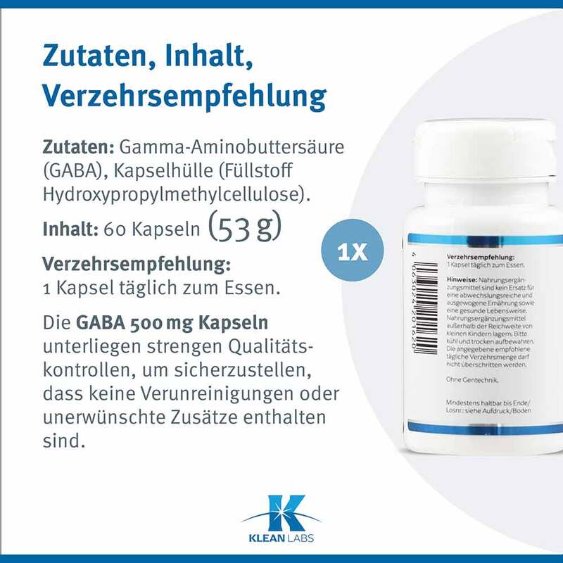 Gamma-Aminobuttersäure (GABA), Kapselhülle Hydroxypropylmethylcellulose, Füllstoff mikrokristalline Cellulose.