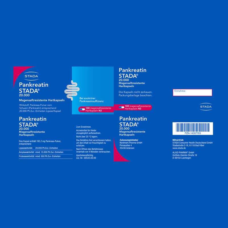 Pankreatin STADA® 20.000 magensaftresistente Hartkapseln. Wirkstoff: Pankreas-Pulver vom Schwein (Pankreatin) entsprechend 20.000 Ph.Eur.-Einheiten Lipase/Kapsel. Wird Zur Behandlung einer exokrinen Pankreasinsuffizienz angewendet. Hierbei produziert die Bauchspeicheldrüse nicht genügend Enzyme, um die Nahrung zu verdauen. Pankreatin STADA® kann bei Kindern, Jugendlichen und Erwachsenen angewendet werden. Die Behandlung mit Pankreatin STADA® verbessert die Symptome der exokrinen Pankreasinsuffizienz, einschließlich Stuhlkonsistenz (z.B. fettiger Stuhl), Bauchschmerzen, Flatulenz und Stuhlfrequenz (Durchfall oder Verstopfung). Wenn Sie sich nach 5 Tagen nicht besser oder gar schlechter fühlen, wenden Sie sich an Ihren Arzt. Zu Risiken und Nebenwirkungen lesen Sie die Packungsbeilage und fragen Sie Ihre Ärztin, Ihren Arzt oder in Ihrer Apotheke. Zulassungsinhaber: Nordmark Pharma GmbH, Pinnauallee 4, 25436 Uetersen. Mitvertrieb: STADA Consumer Health Deutschland GmbH, Stadastraße 2–18, 61118 Bad Vilbel. Mitvertrieb: ALIUD PHARMA® GmbH, Gottlieb-Daimler-Straße 19, D-89150 Laichingen. Stand: Februar 2021