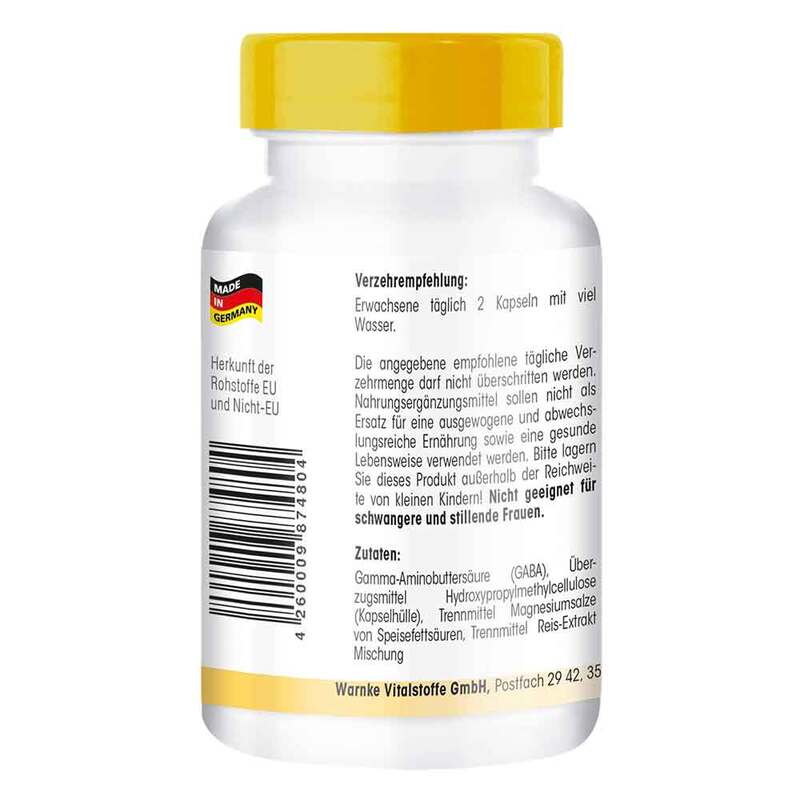 GABA (Gamma-Aminobuttersäure), Überzugsmittel Hydroxypropylmethylcellulose (Kapselhülle), Trennmittel Magnesiumsalze von Speisefettsäuren