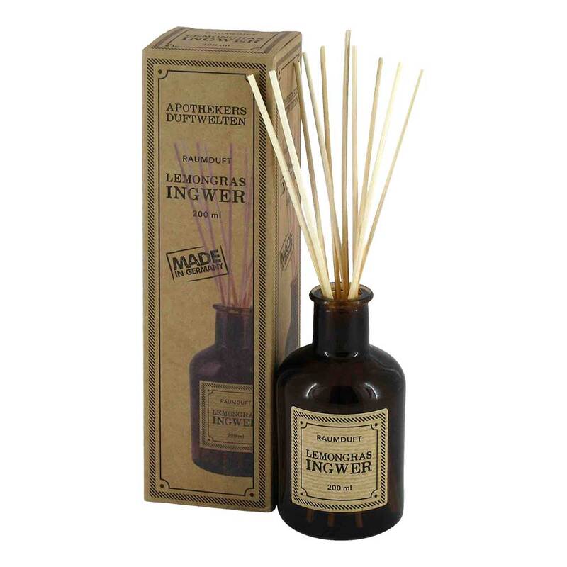 - Lieferumfang: Apothekerflasche mit 200 ml Raumduft Lemongras-Ingwer und 10 Stäbchen