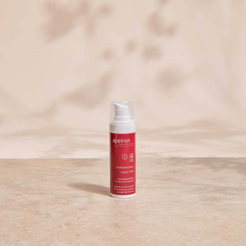 Das Apeiron Rosen-Fluid vitalisierend ist erfrischend und enthält eine angenehm leichte Konsistenz. Das Fluid zieht unmittelbar in die Haut ein ohne einen fettigen Film zu hinterlassen. Es umhüllt sie mit einem sinnlichem Duft und einer sanften, natürlichen Pflege.