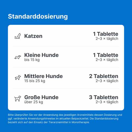 - Kleiner Hund / Katze (bis 15 kg) 2 – 3 mal täglich je 1 Tablette
