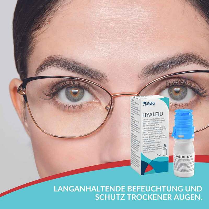 HYALFID vereint hochwirksame Inhaltsstoffe, die speziell für den Schutz und die Pflege der Augen entwickelt wurden. Die Dosierung von 0,15 % Natriumhyaluronat (FHA 1.0) sorgt für eine sofortige und langanhaltende Befeuchtung der Augenoberfläche.