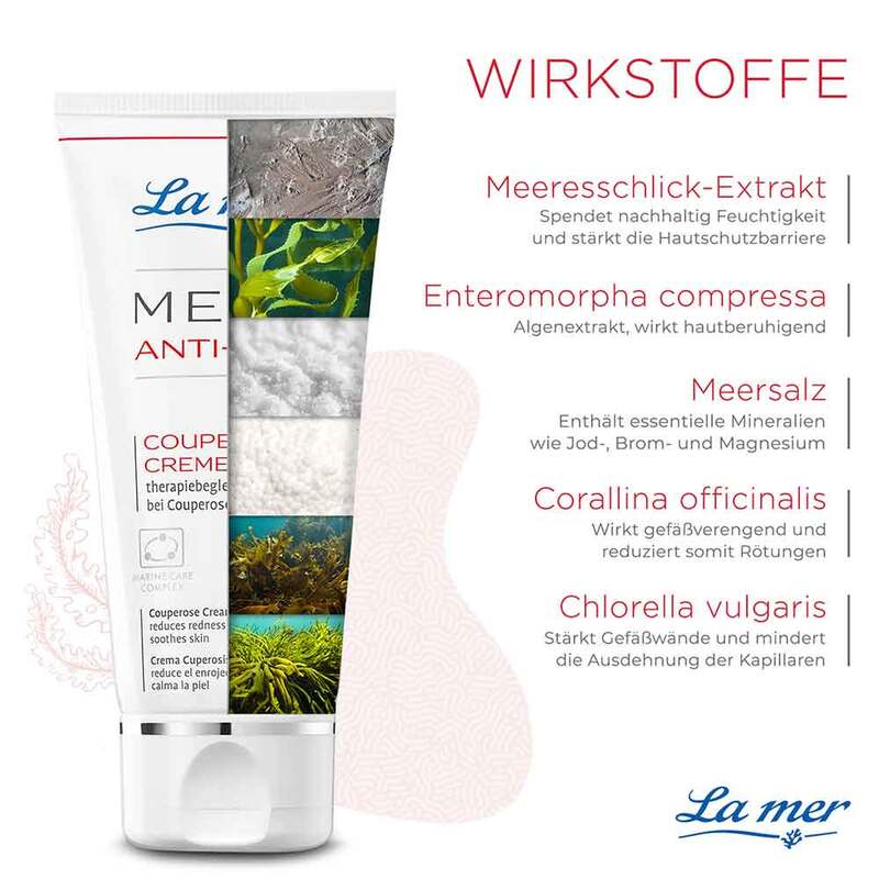 In Med+ Anti-Red wirkt der Marine Care Complex aus Meeresschlick-Extrakt, Grünalgenextrakt und Meersalz mit zusätzlichen Wirkstoffen für spezifische Bedürfnisse gereizter Haut mit vorübergehender oder dauerhafter Rötung. Die La mer Med+ Anti-Red Produkte bieten dank der Kraft des Meeres therapiebegleitende Pflege bei zu Couperose und zu Rosazea neigender Haut. So werden Hautirritationen gemildert und Rötungen kaschiert.