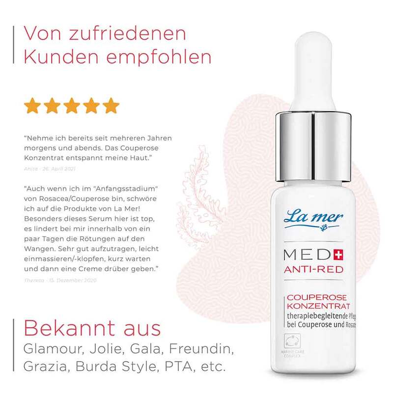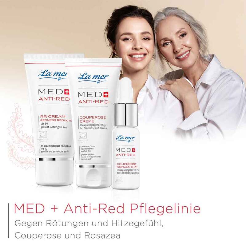 In Med+ Anti-Red wirkt der Marine Care Complex aus Meeresschlick-Extrakt, Grünalgenextrakt und Meersalz mit zusätzlichen Inhaltsstoffen für spezifische Bedürfnisse gereizter Haut mit vorübergehender oder dauerhafter Rötung. Die La mer Med+ Anti-Red Produkte bieten dank der Kraft des Meeres therapiebegleitende Pflege bei zu Couperose und zu Rosazea neigender Haut. So werden Hautirritationen gemildert und Rötungen kaschiert.