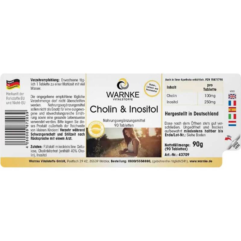Füllstoff mikrokristalline Cellulose, Cholinbitartrat (enthält 40% Cholin), Inositol.