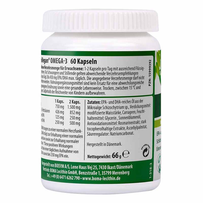 OmniVegan® Omega-3 ist von der Britischen Vegan Society und der Dänischen Vegetarian Society zertifiziert. Das Produkt ist ohne tierische Inhaltsstoffe, künstliche Aromen oder Farbstoffe.