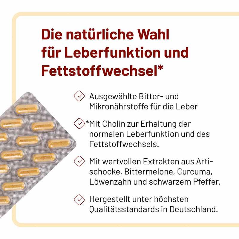 - eine wertvolle Kombination der Extrakte aus Löwenzahn, Curcuma longa, Bittermelone, Artischocke, Schwarzer Pfeffer sowie den Mikronährstoffen Cholin, Vitamin B6 und Vitamin B2
