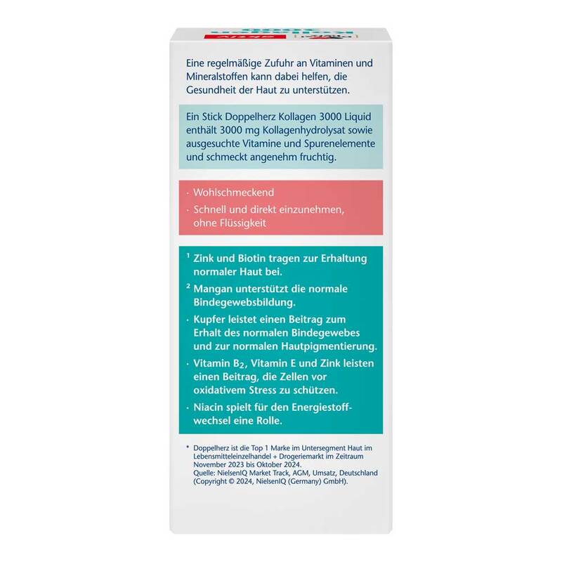 Ein Stick Doppelherz Kollagen 3000 Liquid enthält 3000 mg Kollagenhydrolysat und ausgesuchte Vitamine und Spurenelemente und schmeckt angenehm fruchtig.