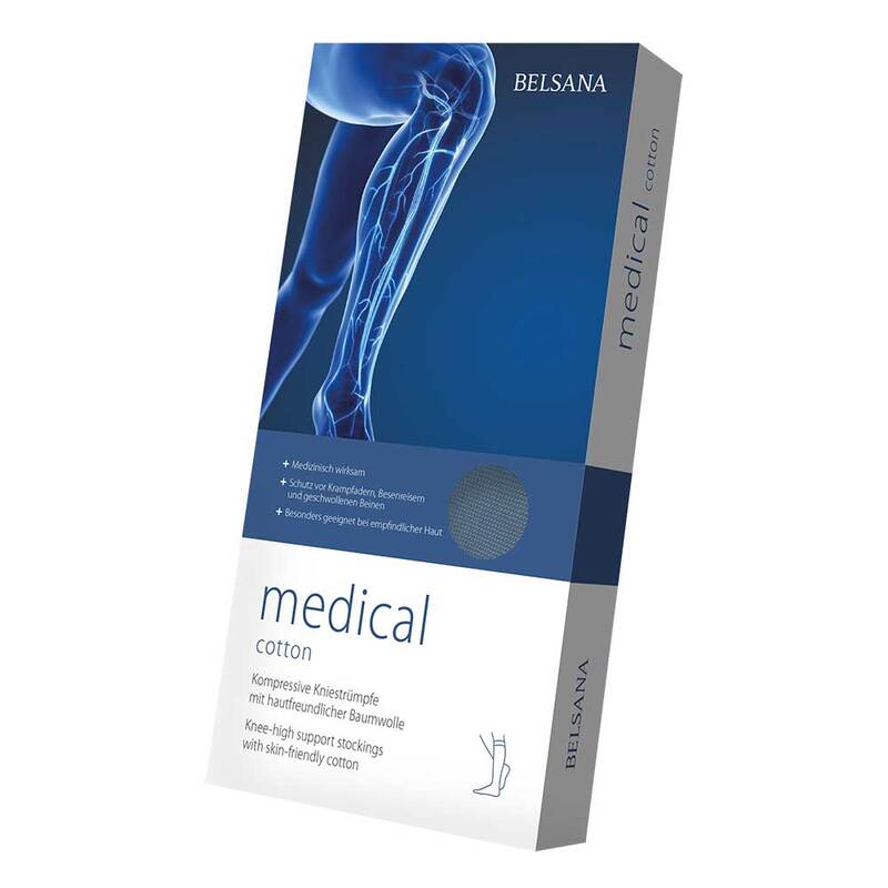 Bei den BELSANA medical cotton handelt es sich um kompressive Kniestrümpfe. Sie vereinen zahlreiche Vorteile: Sie verhindern geschwollene Füße sowie Beine, schützen vor Krampfadern und Besenreisern und wirken vorbeugend gegen Thrombosen. Dabei zeichnen sich die Strümpfe durch ihre medizinische Wirksamkeit aus. Sie sind hautfreundlich dank natürlicher Baumwolle und schenken Ihnen ein weiches Tragegefühl – sowohl für die Frau als auch den Mann!