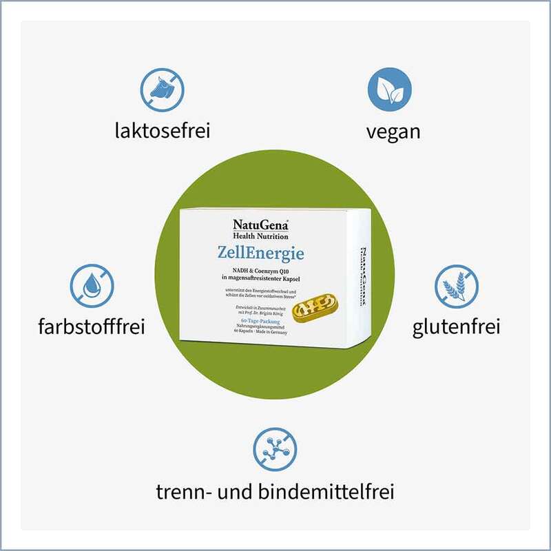 Ubichinon, Magnesiumtaurat, magensaftresistente Kapselhülle: Hydroxypropylmethylcellulose (HPMC); R-Alpha-Liponsäure, Nicotinamid, Riboflavin-5-Phosphat, Staudenknöterich-Extrakt, Nicotinsäureamid-Adenin-Dinukleotid, Thiaminhydrochlorid, Eisen-II-Fumarat, Kupfer-II-Gluconat.