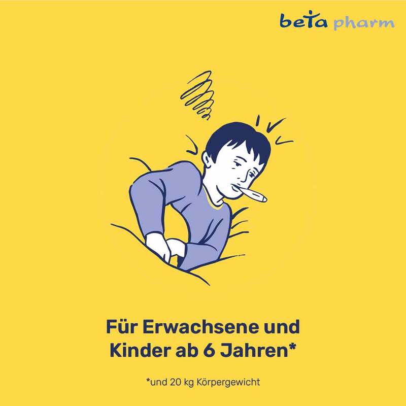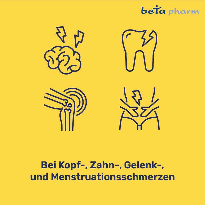 Ibubeta® 400 akut Filmtabletten Wirkstoff: Ibuprofen. Anw.: Leichte bis mäßig starke Schmerzen, wie Kopfschmerzen, Zahnschmerzen, Regelschmerzen und Fieber. Warnh.: Bei Schmerzen oder Fieber ohne ärztlichen Rat nicht länger anwenden als in der Packungsbeilage vorgegeben. Zu Risiken und Nebenwirkungen lesen Sie die Packungsbeilage und fragen Sie Ihre Ärztin, Ihren Arzt oder in Ihrer Apotheke. betapharm Arzneimittel GmbH, 86156 Augsburg. www.betapharm.de