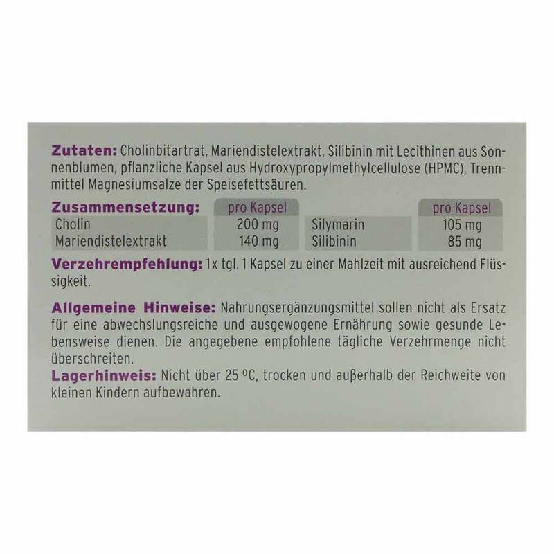 Cholinbitartrat, Mariendistelextrakt, Silibinin mit Lecithin aus Sonnenblumen, pflanzliche Kapsel aus Hydroxypropylmethylcellulose (HPMC), trennmittel Magnesiumsalze der Speisefettsäuren.