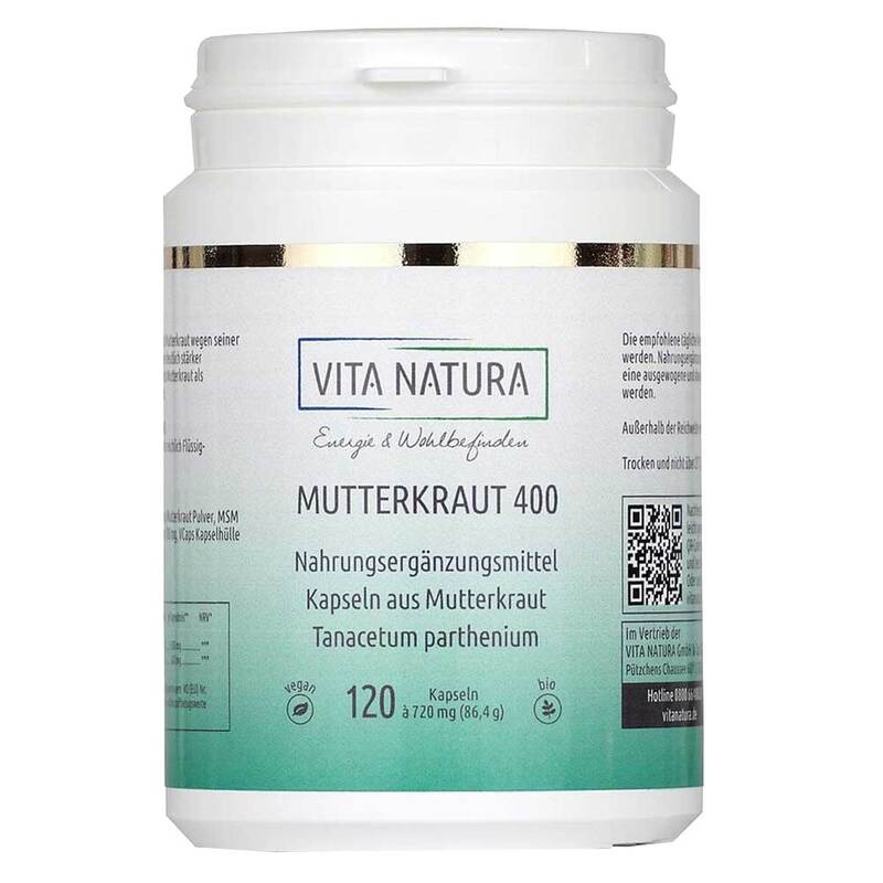 Enthält 400 mg hochwertiges Mutterkraut je Kapsel. Zusätzlich 200 mg MSM je Kapseln zur Verbesserung der Aufnahme.