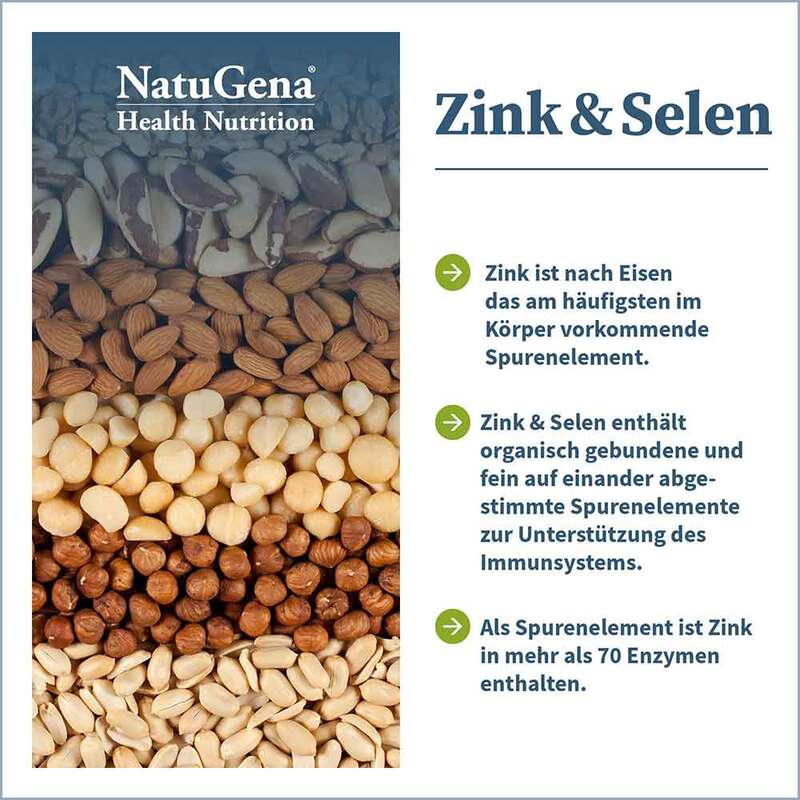 * Zink trägt zu einer normalen Funktion des Immunsystems bei. Zink trägt dazu bei, die Zellen vor oxidativem Stress zu schützen. Zink hat eine Funktion bei der Zellteilung. Zink trägt zur Erhaltung normaler Knochen bei. Zink trägt zur Erhaltung normaler Sehkraft bei. Zink trägt zur Erhaltung normaler Haare bei. Zink trägt zur Erhaltung normaler Nägel bei. Zink trägt zur Erhaltung normaler Haut bei. Zink trägt zu einer normalen kognitiven Funktion bei. Zink trägt zu einer normalen Fruchtbarkeit und einer normalen Reproduktion bei. Zink trägt zur Erhaltung eines normalen Testosteronspiegels im Blut bei. Zink trägt zu einem normalen Stoffwechsel von Makronährstoffen bei. Zink trägt zu einem normalen Vitamin-A-Stoffwechsel bei. Zink trägt zu einem normalen Fettsäurestoffwechsel bei. Zink trägt zu einem normalen Säure-Basen-Stoffwechsel bei. Zink trägt zu einem normalen Kohlenhydrat-Stoffwechsel bei. Zink trägt zu einer normalen DNA-Synthese bei. Selen trägt zu einer normalen Funktion des Immunsystems bei. Selen trägt dazu bei, die Zellen vor oxidativem Stress zu schützen. Selen trägt zu einer normalen Schilddrüsenfunktion bei. Selen trägt zur Erhaltung normaler Haare bei. Selen trägt zur Erhaltung normaler Nägel bei. Selen trägt zu einer normalen Spermabildung bei.
