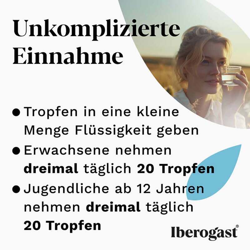 Soweit vom Arzt nicht anders verordnet, wird Iberogast Advance 3-mal täglich vor oder zu den Mahlzeiten mit etwas Flüssigkeit (vorzugsweise Wasser) eingenommen.Erwachsene und Jugendliche ab 12 Jahre nehmen 3 x täglich 20 Tropfen.