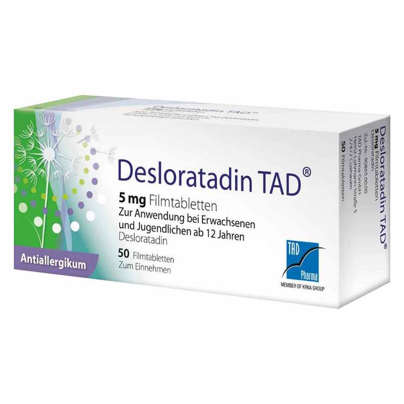 Desloratadin TAD® 5 mg Filmtabletten. Wirkstoff: Desloratadin. Anwendungsgebiete: Desloratadin TAD® bessert die Symptome bei allergischer Rhinitis (z. B. Heuschnupfen oder Hausstaubmilben-Allergie) bei Erwachsenen und Jugendlichen ab 12 Jahren. Diese Symptome beinhalten Niesen, laufende oder juckende Nase, Juckreiz am Gaumen und juckende, gerötete oder tränende Augen. Desloratadin TAD® wird ebenfalls angewendet zur Besserung der Symptome bei Urtikaria. Diese Symptome beinhalten Juckreiz und Quaddeln. Wenn Sie sich nach 3 Tagen nicht besser oder gar schlechter fühlen, wenden Sie sich an Ihren Arzt. Warnhinweise: Arzneimittel enthält Lactose. Packungsbeilage beachten. Stand: März 2020. Zu Risiken und Nebenwirkungen lesen Sie die Packungsbeilage und fragen Sie Ihre Ärztin, Ihren Arzt oder in Ihrer Apotheke.