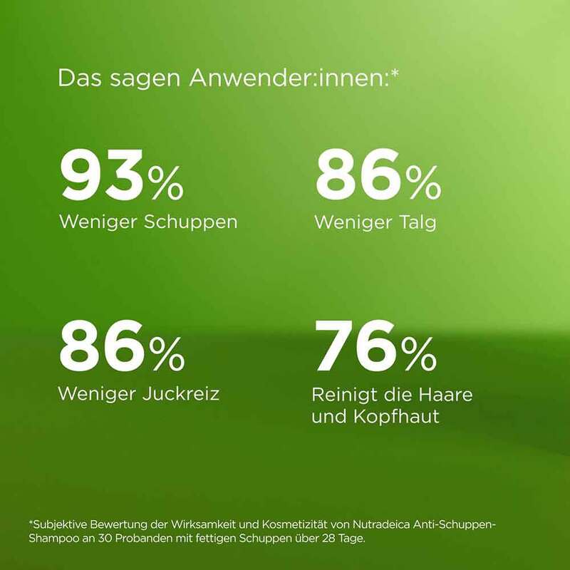 ¹ Subjektive Bewertung der Wirksamkeit und Kosmetizität von Nutradeica Anti-Schuppen-Shampoo an 30 Probanden mit fettigen Schuppen über 28 Tage.