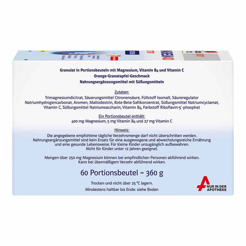 - 400 mg Magnesium sinnvoll kombiniert mit 5 mg Vitamin B6 + 27 mg Vitamin C