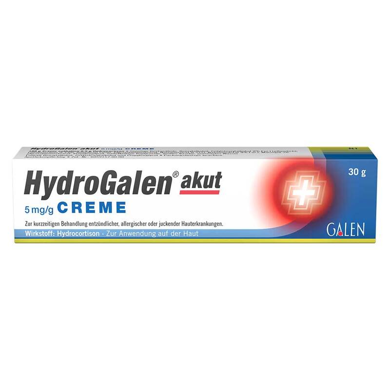 HydroGalen® akut 5 mg/g Creme. Wirkstoff: Hydrocortison. Anwendungsgebiete: HydroGalen® akut 5 mg/g ist eine entzündungshemmende Creme zur Anwendung auf der Haut. Sie wird angewendet zur kurzzeitigen (maximal 2 Wochen) Anwendung zur Behandlung von entzündlichen, allergischen oder juckenden Hauterkrankungen mit mäßiger Ausprägung, die auf eine äußerliche Therapie mit schwach wirksamen Kortikosteroiden ansprechen. Für Erwachsene und Kinder ab dem vollendeten 6. Lebensjahr. Zu Risiken und Nebenwirkungen lesen Sie die Packungsbeilage und fragen Sie Ihre Ärztin, Ihren Arzt oder in Ihrer Apotheke. Stand: Mai 2020. GALENpharma GmbH, Wittland 13, 24109 Kiel