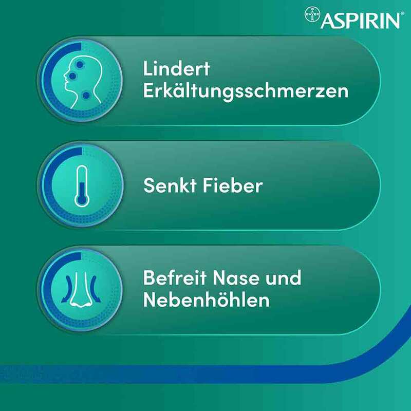 Aspirin® Complex Granulat-Sticks 500 mg/30 mg Wirkstoffe: Acetylsalicylsäure, Pseudoephedrinhydrochlorid Anwendungsgebiete: Zur symptomatischen Behandlung bei verstopfter Nase bzw. Nasennebenhöhlen (Rhinosinusitis) mit Schmerzen und Fieber im Zusammenhang mit Erkältungs- und/oder grippeähnlichen Symptomen. Hinweis: Enthält Isomalt und Benzylalkohol. Packungsbeilage beachten. Ohne ärztlichen Rat nicht länger anwenden als in der Packungsbeilage vorgegeben! Zu Risiken und Nebenwirkungen lesen Sie die Packungsbeilage und fragen Sie Ihre Ärztin, Ihren Arzt oder in Ihrer Apotheke. Bayer Vital GmbH, 51368 Leverkusen, Deutschland