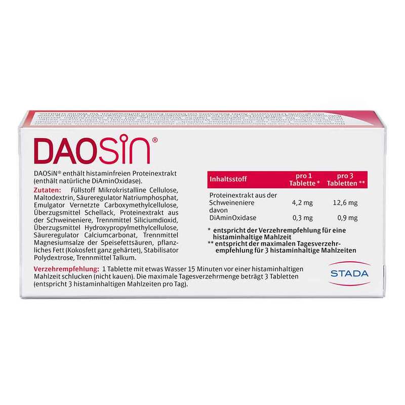 Enthält histaminfreien Proteinextrakt (enthält natürliche DiAminOxidase). Alkohol und einige Medikamente können die Aktivität des DAO-Enzyms weitgehend hemmen.