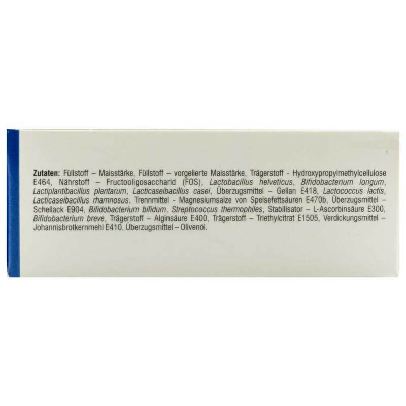 Füllstoff – Maisstärke, Füllstoff – vorgelierte Maisstärke, Trägerstoff - Hydroxypropylmethylcellulose E464, Nährstoff – Fructooligosaccharid (FOS), Lactobacillus helveticus, Bifidobacterium longum, Lactiplantibacillus plantarum, Lacticaseibacillus casei, Überzugsmittel – Gellan E418, Lactococcus lactis, Lacticaseibacillus rhamnosus, Trennmittel - Magnesiumsalze von Speisefettsäuren E470b, Überzugsmittel – Schellack E904, Bifidobacterium bifidum, Streptococcus thermophiles, Stabilisator – L- Ascorbinsäure E300, Bifidobacterium breve, Trägerstoff – Alginsäure E400, Trägerstoff – Triethylcitrat E1505, Verdickungsmittel – Johannisbrotkernmehl E410, Überzugsmittel – Olivenöl.