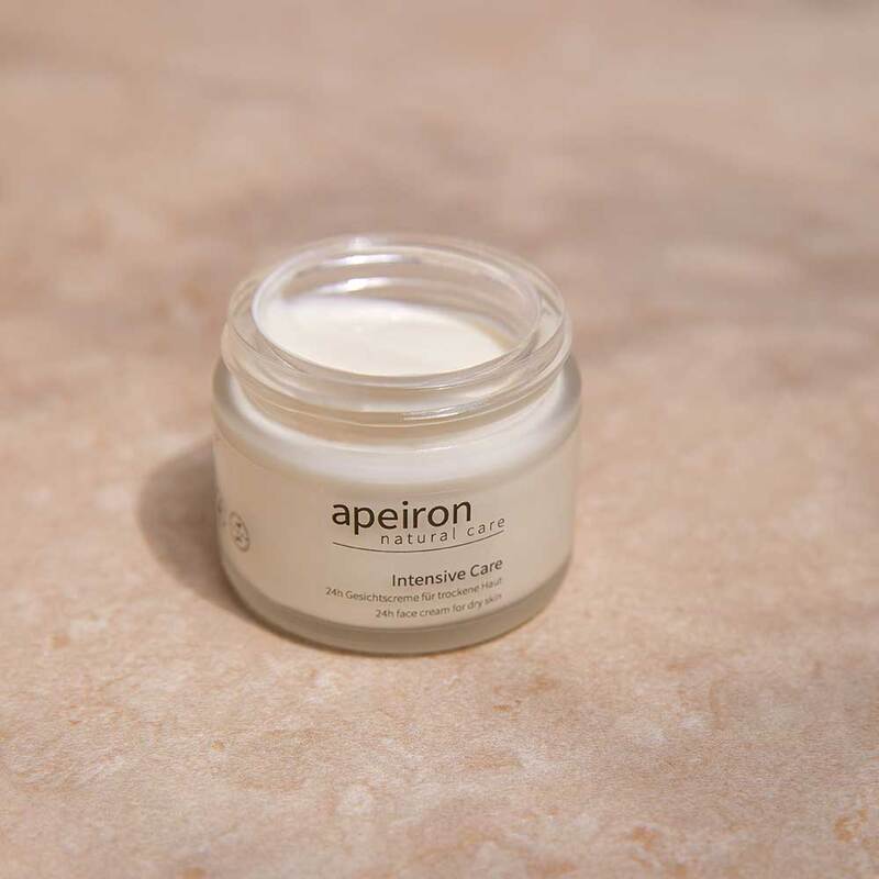 Das enthaltene Jojobaöl zieht schnell ein, pflegt und ist nicht fettend. Hyaluron unterstützt dabei, die natürlichen Vorzeichen der Hautalterung zu mindern. Die wertvolle Kombination aus Pfirsichkernöl, Traubenkernöl, Sanddornöl und Nachtkerzenöl pflegt die Haut samtweich. Die Rezeptur sorgt für ein gepflegtes, strahlendes Hautbild. Apeiron intensiv Care Creme ist ideal für trockene Haut und empfindliche Haut.