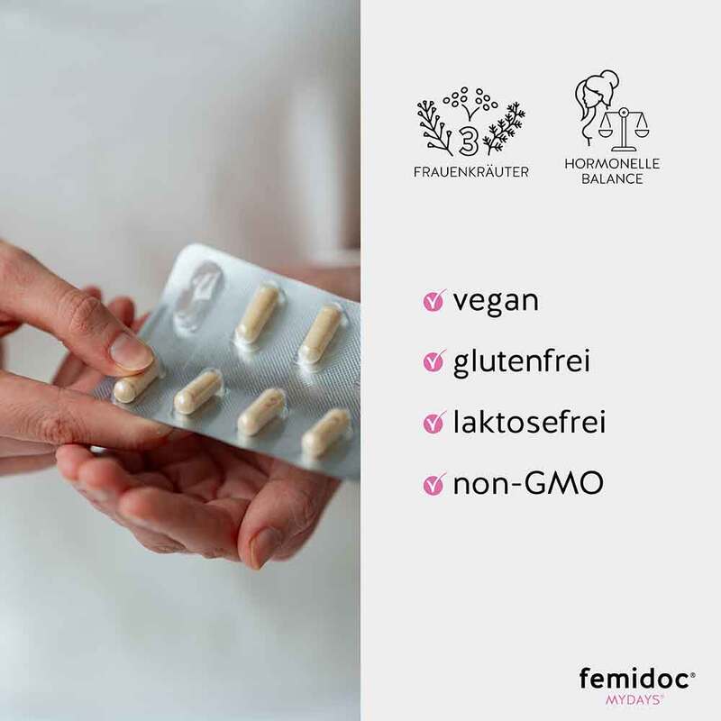 Femidoc MyDays enthält die 3 traditionell verwendeten Frauenkräuter - Frauenmantel, Hirtentäschel und Schafgarbe kombiniert mit Vitamin B6, Vitamin D, Vitamin E und Magnesium.