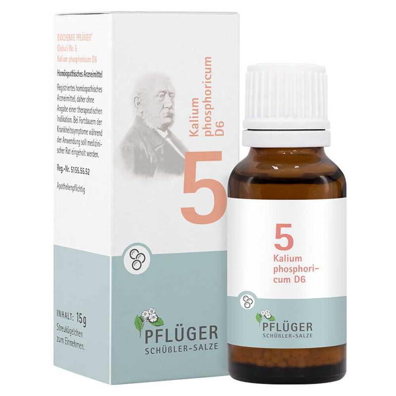 Biochemie Pflüger® Globuli Nr. 5 Kalium phosphoricum D6.Registriertes homöopathisches Arzneimittel, daher ohne Angabe einer therapeutischen Indikation. Gegenanzeigen/Nebenwirkungen: keine bekannt. Enthält Sucrose. Packungsbeilage beachten. Zu Risiken und Nebenwirkungen lesen Sie die Packungsbeilage und fragen Sie Ihre Ärztin, Ihren Arzt oder in Ihrer Apotheke. Homöopathisches Laboratorium Alexander Pflüger