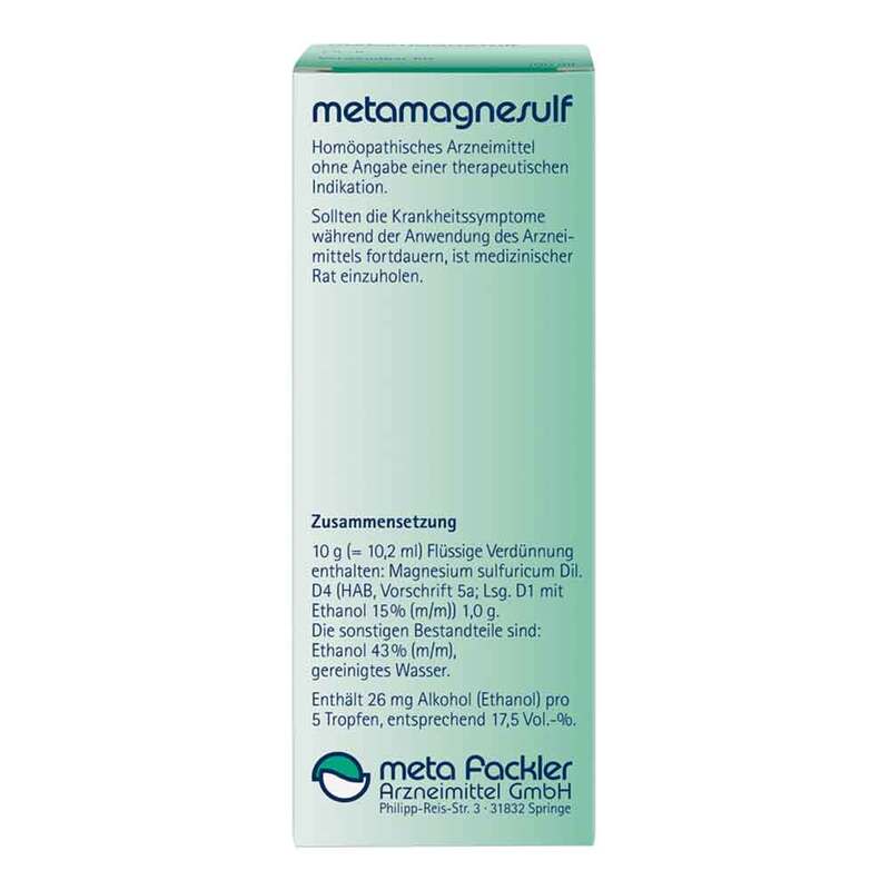 metamagnesulf Wirkstoff: Magnesium sulfuricum Dil. D4. Anwendungsgebiete: Homöopathisches Arzneimittel, daher ohne Angabe einer therapeutischen Indikation. metamagnesulf enthält 17,5 Vol.-% Alkohol. Zu Risiken und Nebenwirkungen lesen Sie die Packungsbeilage und fragen Sie Ihre Ärztin, Ihren Arzt oder in Ihrer Apotheke. meta Fackler Arzneimittel GmbH, Philipp-Reis-Str. 3, D-31832 Springe. (05/24)