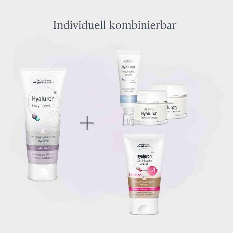Das Hyaluron Enzympeeling eignet sich ideal als Vorbereitung für die nachfolgende Gesichtspflege – etwa für das Hyaluron Feuchtigkeit Serum oder eine der Hyaluron Gesichtscremes von medipharma cosmetics. Auch vor dem Auftragen eines Produkts der Hyaluron Sanfte Bräune-Serie kann das Peeling helfen, ein gleichmäßigeres und natürliches Ergebnis zu erzielen.