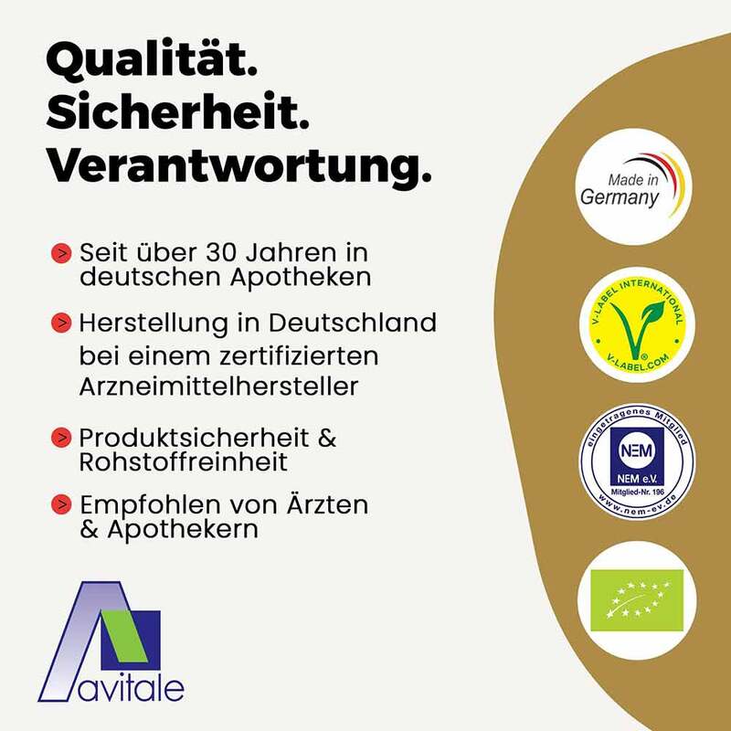 Avitale Coenzym Q10 Komplex Kapseln sind gluten-, soja- und hefefrei und werden ohne Einsatz von Gentechnik in Deutschland hergestellt.