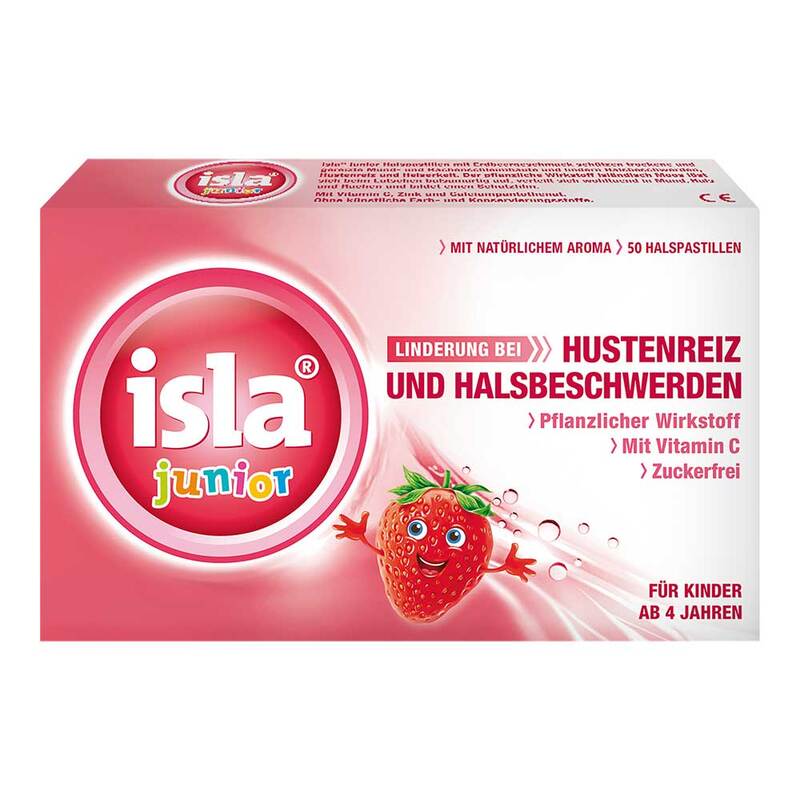 Für kleine Halsschmerz-Patient*innen: Weiche Pastille mit Isländisch Moos Die isla® junior Halspastillen enthalten einen Extrakt aus pflanzlichem Isländisch Moos. Dieser besteht zu 80 % aus Schleimstoffen, die zusammen mit dem Speichel einen Schutzfilm bilden, der sich wie Balsam auf die Mund- und Rachenschleimhäute legt und diese so befeuchtet und vor weiteren Reizen schützt. In der Folge wird die Schleimhautregeneration gefördert und Hustenreiz effektiv gelindert. Daneben sind Vitamin C, Zink und Calciumpantothenat enthalten.