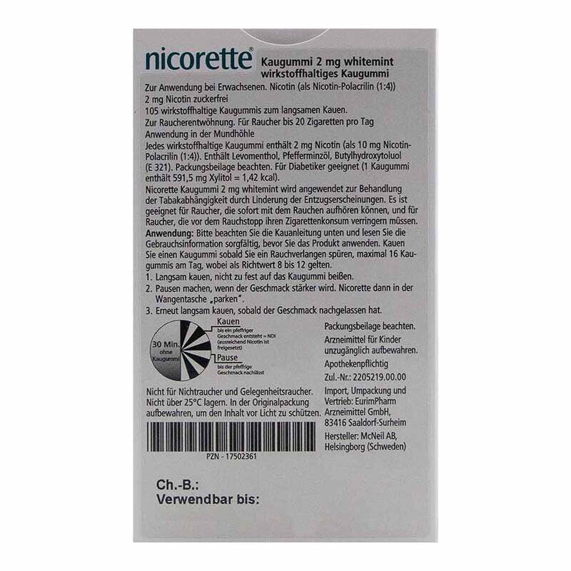 Es lindert nicht nur Rauchverlangen, sondern auch typische Entzugssymptome während der Entwöhnung, wie innere Unruhe und gesteigerter Appetit. Mit 2 mg Nikotin pro Kaugummi sind diese Kaugummis für Personen geeignet, die bis zu 20 Zigaretten pro Tag rauchen. Werden mehr als 20 Stück pro Tag geraucht, empfiehlt sich die Nikotinersatztherapie mit den höher dosierten nicorette® Kaugummis 4 mg.