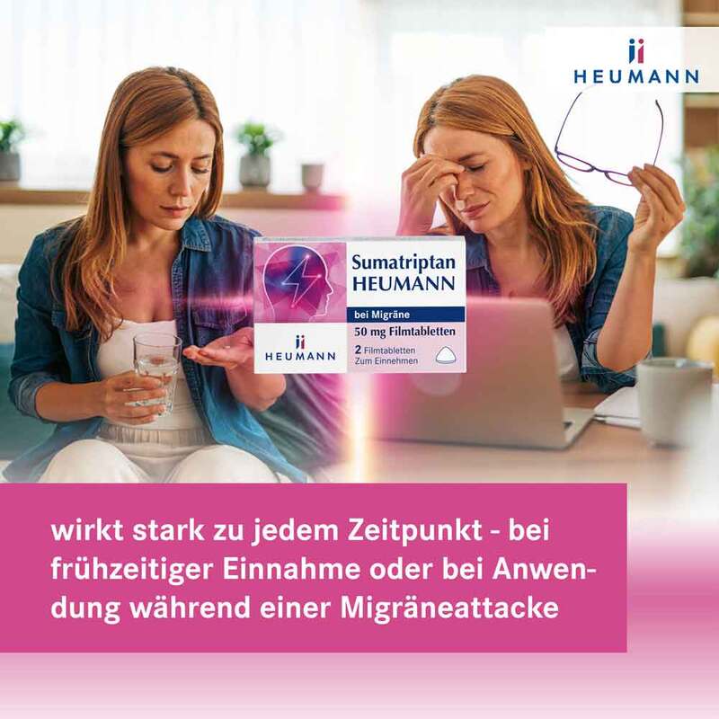 Sumatriptan HEUMANN bei Migräne 50 mg Filmtabletten (Wirkstoff: Sumatriptan).Zur Anwendung bei Erwachsenen Anwendungsgebiete: Zur akuten Behandlung der Kopfschmerzphase bei Migräneanfällen mit und ohne Aura bei Erwachsenen, nach der Erstdiagnose einer Migräne durch einen Arzt. Warnhinweise: Dieses Arzneimittel ist nur für Patienten geeignet, die wissen, dass sie eine Migräne haben. Wenn Sie sich nicht sicher sind, ob Sie unter Migräne leiden, sprechen Sie mit Ihrem Arzt oder Apotheker. Typische Symptome einer Migräne sind: einseitig auftretende, hämmernde Kopfschmerzen; Übelkeit; Empfindlichkeit gegen Licht und Geräusche. Arzneimittel für Kinder unzugänglich aufbewahren. Enthält Lactose. Stand: 09/2025 Zu Risiken und Nebenwirkungen lesen Sie die Packungsbeilage und fragen Sie Ihre Ärztin, Ihren Arzt oder in Ihrer Apotheke
