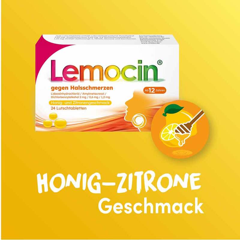 Lemocin® gegen Halsschmerzen Lidocainhydrochlorid / Amylmetacresol / Dichlorbenzylalkohol 2 mg / 0,6 mg / 1,2 mg Honig- und Zitronengeschmack Lutschtabletten. Zur Anwendung bei Erwachsenen und Jugendlichen über 12 Jahren. Wirkstoffe: Lidocainhydrochlorid-Monohydrat, Amylmetacresol, 2,4-Dichlorbenzylalkohol. Wird angewendet zur lokalen Linderung der Beschwerden bei Halsschmerzen. Wenn Sie sich nach 2 Tagen nicht besser oder gar schlechter fühlen, wenden Sie sich an Ihren Arzt. Hinweis: Enthält Gelborange S, Minzöl, Glucose und Saccharose. Zu Risiken und Nebenwirkungen lesen Sie die Packungsbeilage und fragen Sie Ihre Ärztin, Ihren Arzt oder in Ihrer Apotheke. STADA Consumer Health Deutschland GmbH, Stadastraße 2–18, 61118 Bad Vilbel. Stand: November 2022.