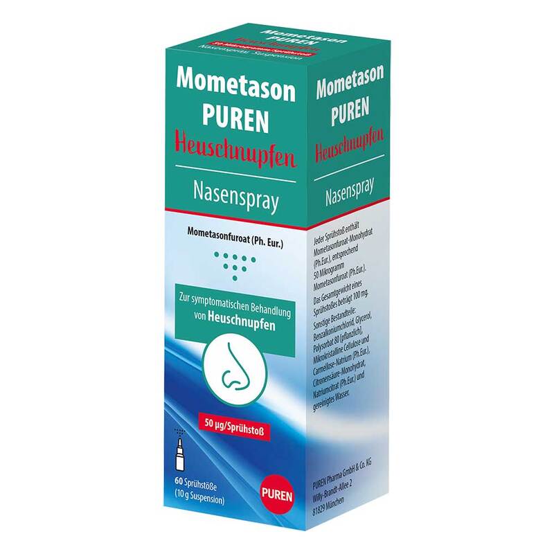 Mometason PUREN Heuschnupfen 50 Mikrogramm/Sprühstoß Nasenspray, Suspension Wirkstoff: Jeder Sprühstoß enthält Mometasonfuroat-Monohydrat (Ph.Eur.), entsprechend 50 Mikrogramm Mometasonfuroat (Ph.Eur.). Das Gesamtgewicht eines Sprühstoßes beträgt 100 mg. Anwendungsgebiete: bei Erwachsenen zur symptomatischen Behandlung einer saisonalen allergischen Rhinitis bestimmt, sofern die Erstdiagnose der saisonalen allergischen Rhinitis durch einen Arzt erfolgt ist. Warnhinweise: Enthält Benzalkoniumchlorid. Packungsbeilage beachten. Arzneimittel für Kinder unzugänglich aufbewahren. Stand: 05/2022. Zu Risiken und Nebenwirkungen lesen Sie die Packungsbeilage und fragen Sie Ihre Ärztin, Ihren Arzt oder in Ihrer Apotheke.