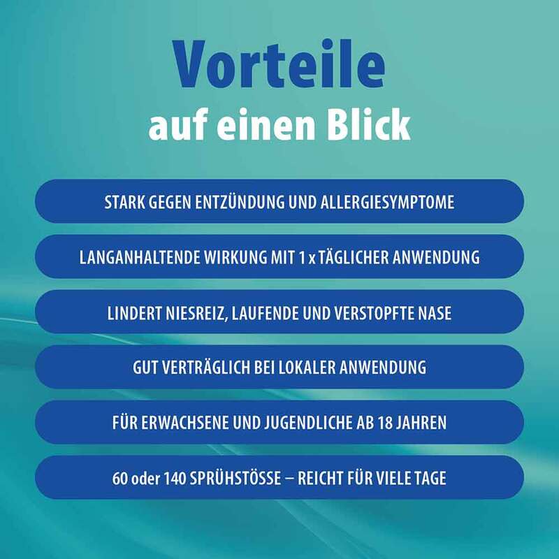 Mometason PUREN Heuschnupfen 50 Mikrogramm/Sprühstoß Nasenspray, Suspension Wirkstoff: Jeder Sprühstoß enthält Mometasonfuroat-Monohydrat (Ph.Eur.), entsprechend 50 Mikrogramm Mometasonfuroat (Ph.Eur.). Das Gesamtgewicht eines Sprühstoßes beträgt 100 mg. Anwendungsgebiete: bei Erwachsenen zur symptomatischen Behandlung einer saisonalen allergischen Rhinitis bestimmt, sofern die Erstdiagnose der saisonalen allergischen Rhinitis durch einen Arzt erfolgt ist. Warnhinweise: Enthält Benzalkoniumchlorid. Packungsbeilage beachten. Arzneimittel für Kinder unzugänglich aufbewahren. Stand: 05/2022. Zu Risiken und Nebenwirkungen lesen Sie die Packungsbeilage und fragen Sie Ihre Ärztin, Ihren Arzt oder in Ihrer Apotheke.