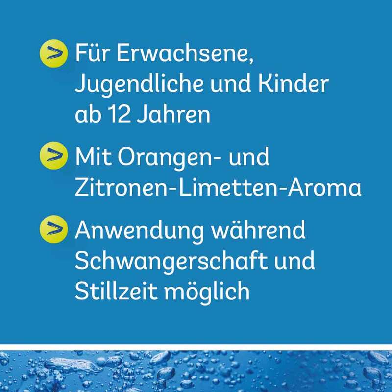 Sonstige Bestandteile: Orangen-Aroma (enthält: Geschmacksstoffe, Maltodextrin, arabisches Gummi, all-rac-a-Tocopherol) und Zitronen-Limetten-Aroma (enthält: Geschmacksstoffe, Maltodextrin, Mannitol (Ph.Eur.), D-Glucono-1,5-lacton, Sorbitol (Ph.Eur.), arabisches Gummi, hochdisperses Siliciumdioxid), Saccharin-Natrium (Ph.Eur.), Hochdisperses Siliciumdioxid