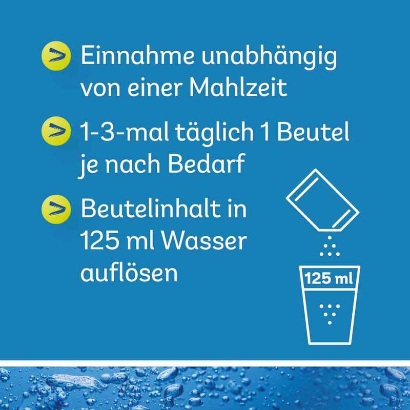 Herstellen der Lösung: Öffnen Sie den Beutel und geben Sie den Inhalt in ein Glas. Fügen Sie ca. 125 ml Wasser hinzu. Rühren Sie so lange, bis sich das Pulver vollständig aufgelöst hat und die Lösung klar oder nur noch leicht trüb ist. Nun können Sie die Lösung trinken.