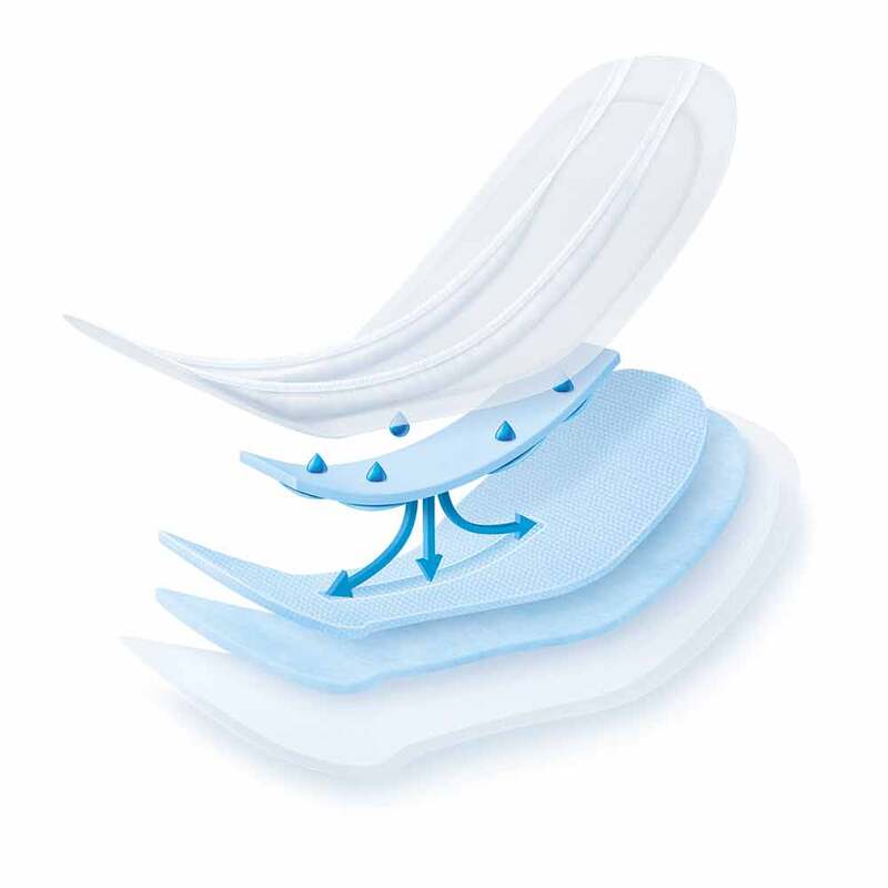 Rückseite: Polyethylen, Vlies-Folien-Laminat, weiß, Saugkern: Zellstoff* , Superabsorbierendes Polymer, pH-Pufferlösung, Vlies, hydrophil, weiß Kleber: Schmelzkraftkleber Oberseite: Polypropylen-Vlies, hydrophil, weiß Bündchen: Polypropylen-Vlies, hydrophob, weiß Elastikfäden: Elastikfäden für Beinabschluss und Innenbündchen Nässeindikator: Wasserlösliche Tinte *elementarchlorfrei gebleicht
