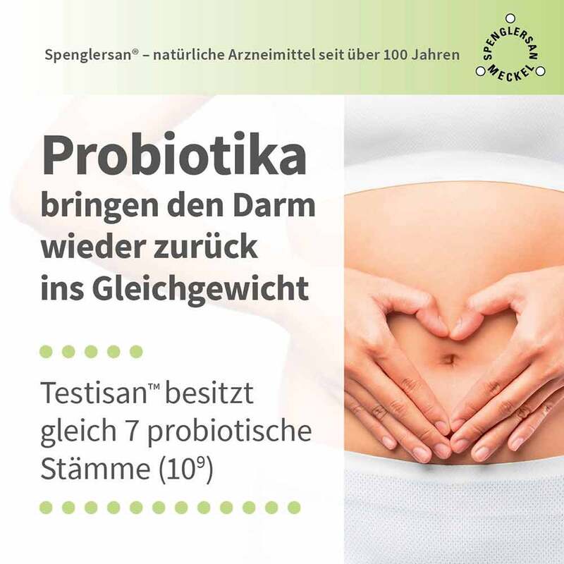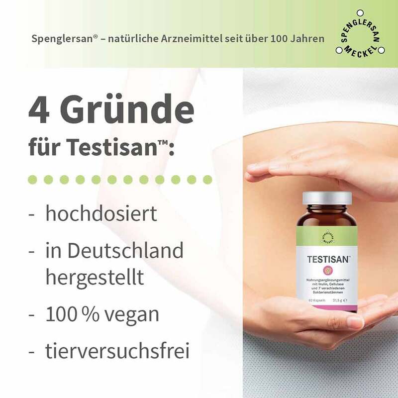 In den Testisan Kapseln sind (Bifidobacterium infantis*, Lactobacillus casei, Lactobacillus rhamnosus*, Lactobacillus acidophilus*, Bifidobacterium bifidum*, Cellulase, Lactobacillus bulgaricus, Bifidobacterium lactis) enthalten, jeweils in der Konzentration 10 9 zur regenerativen Besiedlung des Darms. Die innovative Verkapselung schützt die Bakterien vor Magensäure. Die Bakterien erreichen den Darm unbeschadet.