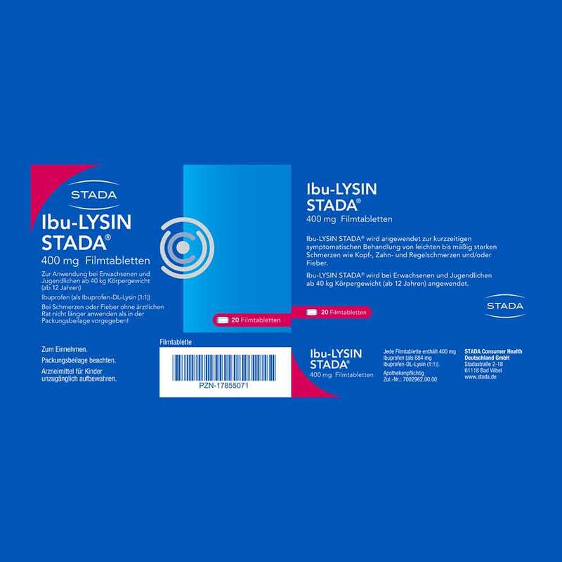 Ibu-LYSIN STADA® 400mg Filmtabletten. Zur Anwendung bei Erwachsenen und Jugendlichen ab 40 kg Körpergewicht (ab 12 Jahren). Wirkstoff: Ibuprofen (als Ibuprofen-DL-Lysin (1:1)). Zur kurzzeitigen symptomatischen Behandlung von leichten bis mäßig starken Schmerzen wie Kopfschmerzen, Zahnschmerzen und Regelschmerzen und/oder Fieber. Hinweis: Bei Schmerzen oder Fieber ohne ärztlichen Rat nicht länger anwenden als in der Packungsbeilage vorgegeben! Zu Risiken und Nebenwirkungen lesen Sie die Packungsbeilage und fragen Sie Ihre Ärztin, Ihren Arzt oder in Ihrer Apotheke. STADA Consumer Health Deutschland GmbH, Stadastraße 2-18, 61118 Bad Vilbel Stand: Oktober 2024