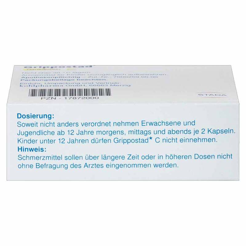 Grippostad® C Hartkapseln. Wirkstoffe: Paracetamol, Ascorbinsäure (Vit. C), Coffein, Chlorphenaminmaleat. Zur symptomatischen Behandlung von gemeinsam auftretenden Beschwerden wie Kopf- und Gliederschmerzen, Schnupfen und Reizhusten im Rahmen einer einfachen Erkältungskrankheit bei Erwachsenen und Jugendlichen ab 12 Jahren. Bei gleichzeitigem Fieber oder erhöhter Körpertemperatur wirkt Grippostad® C fiebersenkend. Durch die fixe Kombination der Wirkstoffe in Grippostad® C kann bei Beschwerden, die überwiegend eines der genannten Symptome betreffen, keine individuelle Dosisanpassung vorgenommen werden. In solchen Situationen sind Arzneimittel in anderer Zusammensetzung vorzuziehen. Hinweis: Schmerzmittel sollen über längere Zeit oder in höheren Dosen nicht ohne Befragen des Arztes eingenommen werden. Enthält: Lactose. Zu Risiken und Nebenwirkungen lesen Sie die Packungsbeilage und fragen Sie Ihre Ärztin, Ihren Arzt oder in Ihrer Apotheke. STADA Consumer Health Deutschland GmbH, Stadastraße 2–18, 61118 Bad Vilbel. Einfuhr, Umpackung und Vertrieb: kohlpharma GmbH, Im Holzhau 8, 66663 Merzig. Stand: April 2022