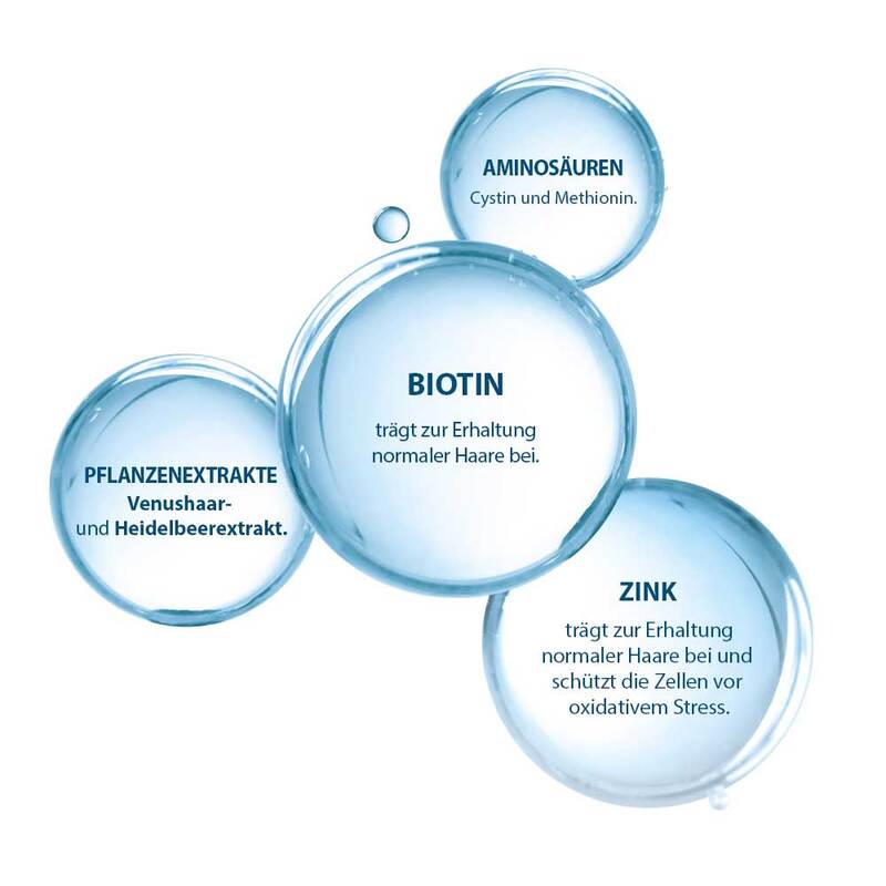 * Biotin und Zink tragen zur Erhaltung normaler Haare bei, Vitamin B 6 trägt zu einer normalen Cystein-Synthese bei und zur Regulierung der Hormontätigkeit. Zink trägt dazu bei, die Zellen vor oxidativem Stress zu schützen
