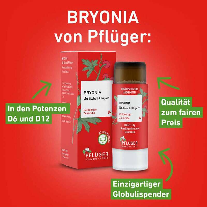 Bryonia D6 Globuli Pflüger®, Zusammensetzung: In 10 g Streukügelchen sind verarbeitet: Wirkstoff: Bryonia Dil. D6 0,1 g. Sonstiger Bestandteil: Saccharose. Registriertes homöopathisches Arzneimittel, daher ohne Angabe einer therapeutischen Indikation. Gegenanzeigen / Nebenwirkungen: Keine bekannt. Enthält Saccharose. Packungsbeilage beachten. Zu Risiken und Nebenwirkungen lesen Sie die Packungsbeilage und fragen Sie Ihre Ärztin, Ihren Arzt oder in Ihrer Apotheke. Homöopathisches Laboratorium Alexander Pflüger GmbH & Co. KG 33378 Rheda-Wiedenbrück info@pflueger.de www.pflueger.de