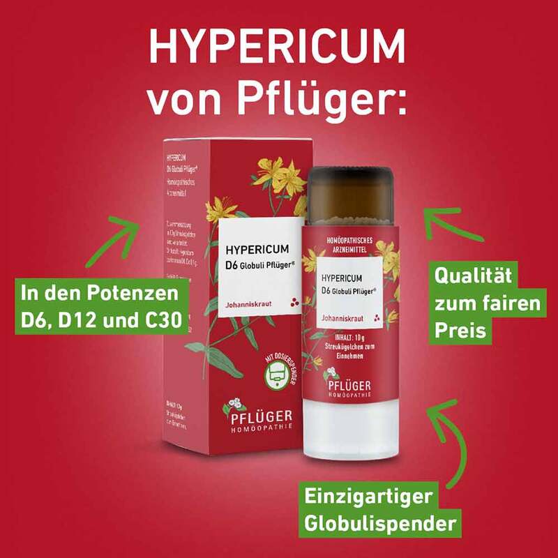 Hypericum D6 Globuli Pflüger®, Zusammensetzung: In 10 g Streukügelchen sind verarbeitet: Wirkstoff: Hypericum perforatum Dil. D6 0,1 g. Sonstiger Bestandteil: Saccharose. Registriertes homöopathisches Arzneimittel, daher ohne Angabe einer therapeutischen Indikation. Gegenanzeigen / Nebenwirkungen: Keine bekannt. Enthält Saccharose. Packungsbeilage beachten. Zu Risiken und Nebenwirkungen lesen Sie die Packungsbeilage und fragen Sie Ihre Ärztin, Ihren Arzt oder in Ihrer Apotheke. Homöopathisches Laboratorium Alexander Pflüger GmbH & Co. KG 33378 Rheda-Wiedenbrück info@pflueger.de www.pflueger.de